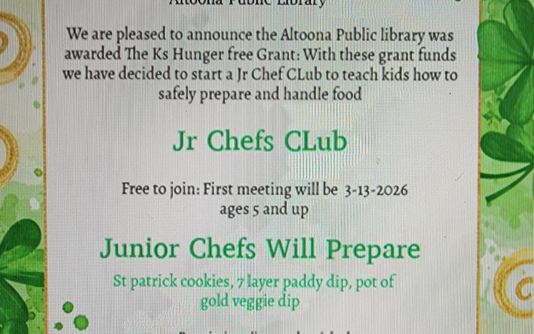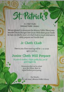 JR Chef Club by Lucretia Calonder | Mar 4, 2026 | Events https://altoonakspubliclibrary.org/wp-content/uploads/2026/02/Yellow-St-Patricks-Day-Party-A4-Made-with-PosterMyWall1.mp4